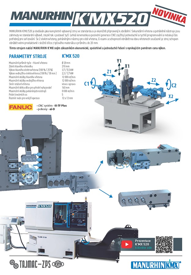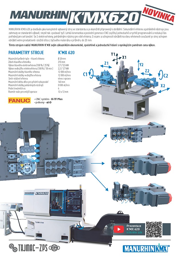 MANURHIN K’MX 520/620 je dodáván jako kompletně vybavený stroj ve standardu a je okamžitě připravený k obrábění. Sekundární vřeteno a poháněné nástroje jsou zahrnuty ve standardní výbavě, stejně tak i podavač tyčí. Lehká kinematika a poslední generace CNC zajištují jednoduché a rychlé programování a redukují čas potřebný pro seřizování. Se 2 elektrovřeteny, poháněnými nástroji pro obě vřetena, C osami a schopností obrábět na obou vřetenech současně je stroj schopen obrábět velmi produktivně i složité dílce z tyčového materiálu o průměru do Ø 20 mm.